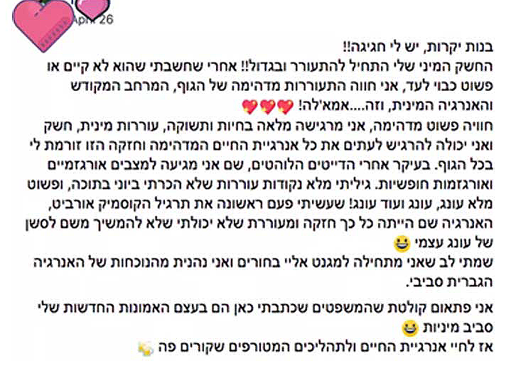 התחלתי להקשיב למפגשים ולקרוא את החומרים ששלחת וגיליתי עולם מלא – הקלילות בה את מדברת על מיניות, והירידה לפרטים – שמחה אותי שמחה גדולה. את נוגעת בכל תחום בחיים עם שמחה, ראיית האפשרויות וחקירה מזוויות שונות שמאפשרת לכל אחד להתחבר מהמקום בו הוא נמצא. כל אלה נגעו בי ושיפרו את הערך העצמי שלי, הקלו עלי ביצירת דרך (חזון) לגבי העתיד ודייקו את מערכות היחסים עם האנשים שהיו בחיי הישנים והחדשים שמצטרפים.